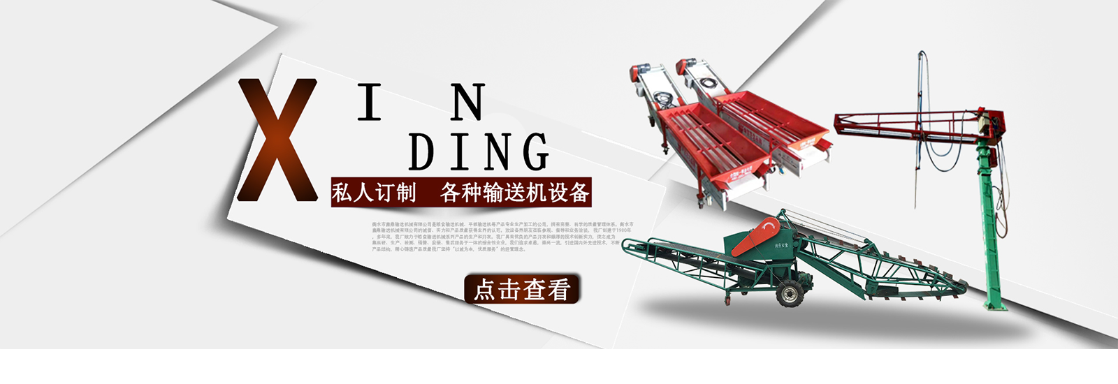 衡水市鑫鼎輸送機械有限公司是糧食輸送機械、平板輸送機等產(chǎn)品專業(yè)生產(chǎn)加工的公司,擁有完整、科學的質(zhì)量管理體系。衡水市鑫鼎輸送機械有限公司的誠信、實力和產(chǎn)品質(zhì)量獲得業(yè)界的認可。歡迎各界朋友蒞臨參觀、指導和業(yè)務洽談。 我廠創(chuàng)建于1980年,多年來,我廠致力于糧食輸送機械系列產(chǎn)品的生產(chǎn)和開發(fā)。我廠具有優(yōu)良的產(chǎn)品開發(fā)和雄厚的技術創(chuàng)新實力,使之成為集科研、生產(chǎn)、檢測、銷售、安裝、售后服務于一體的綜合性企業(yè),我們追求卓越,崇尚一流,引進國內(nèi)外先進技術,不斷產(chǎn)品結(jié)構,精心鑄造產(chǎn)品質(zhì)量我廠堅持“以誠為本,優(yōu)質(zhì)服務”的經(jīng)營理念。。積極拓展市場,贏得了廣大客戶的信賴和一致好評。產(chǎn)品暢銷山西、山東、遼寧、黑龍江、吉林、北京、天津、內(nèi)蒙古等28個省、市、自治區(qū)。